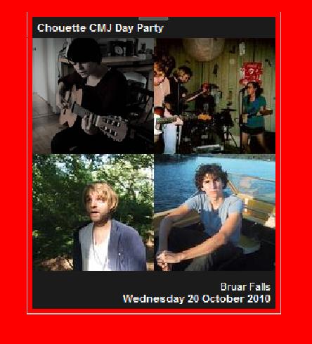 10.06.10 by Jane Lambert Chouette CMJ Day Party @ Bruar Falls (Wednesday) Featuring: Sharon Van Etten, Lower Dens, Highlife and Sebastian Blanck Share this: Click to email a link to a friend (Opens in new window) Email Click to share on X (Opens in new window) X Click to share on Facebook (Opens in new window) Facebook Click to print (Opens in new window) Print Like Loading... Related